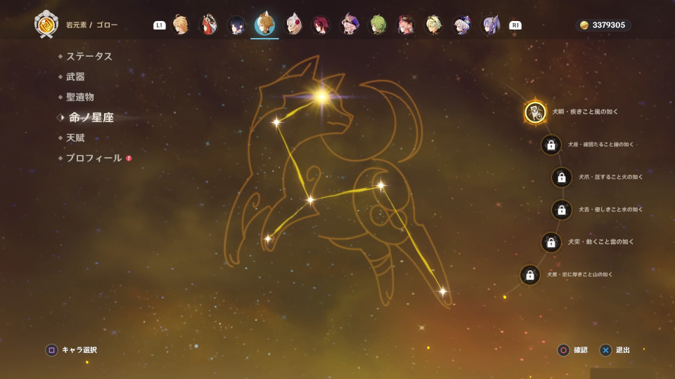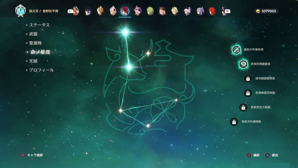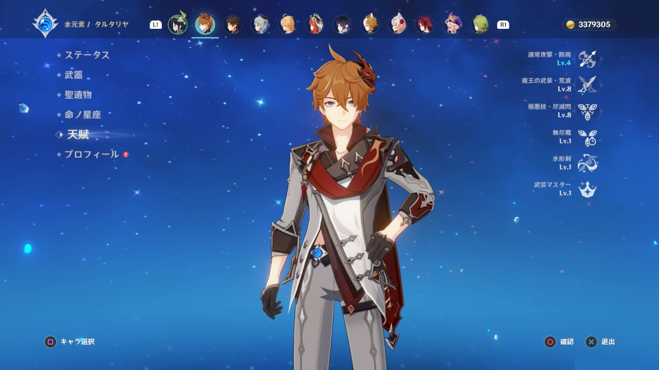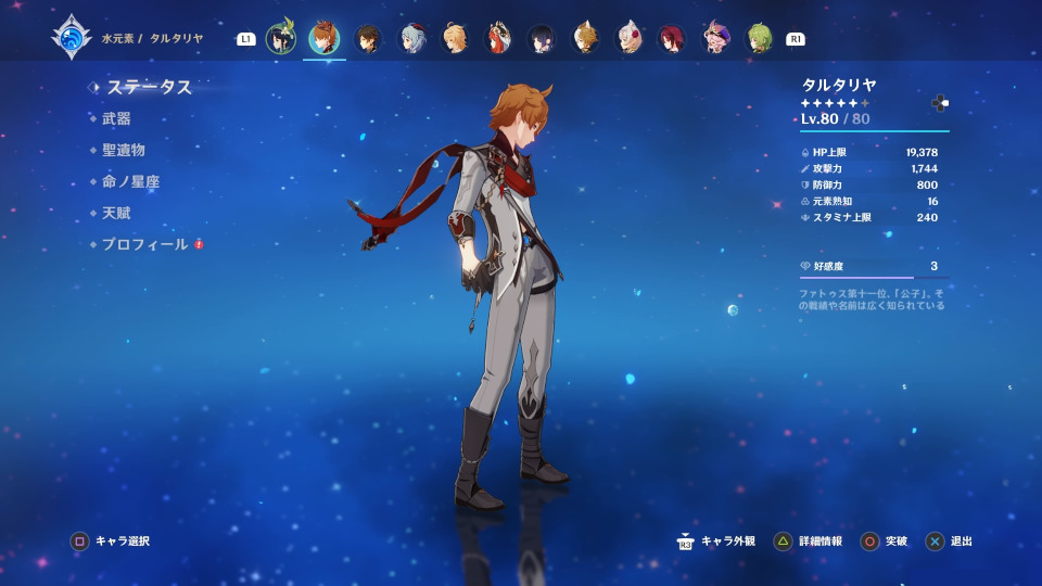 育てて使うキャラは、上の所持キャラでタルタリヤまでです。