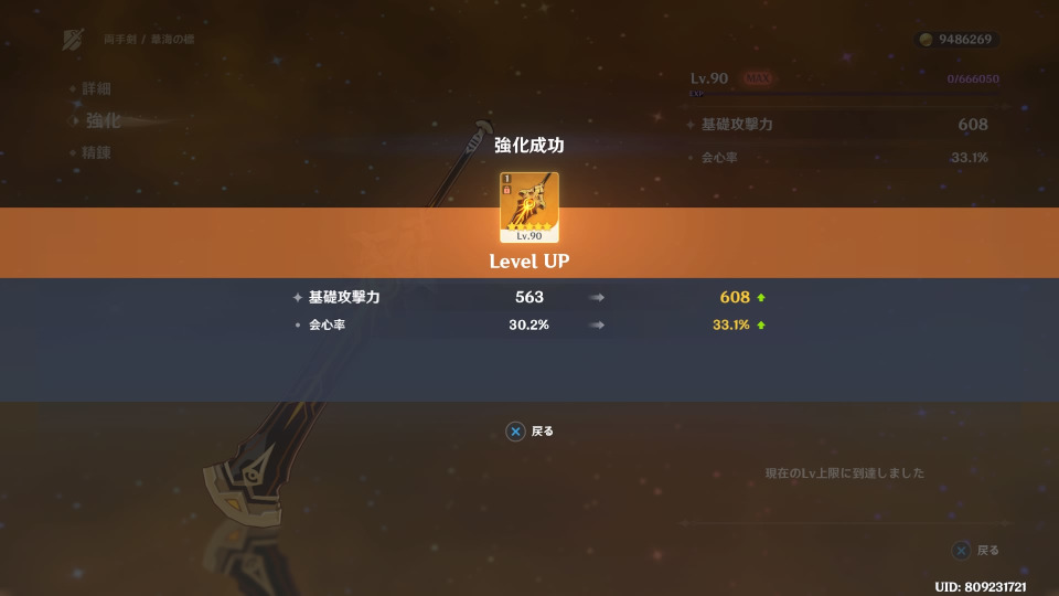 とりあえず、武器強化の素材足りてたのでレベルMAXに出来た。